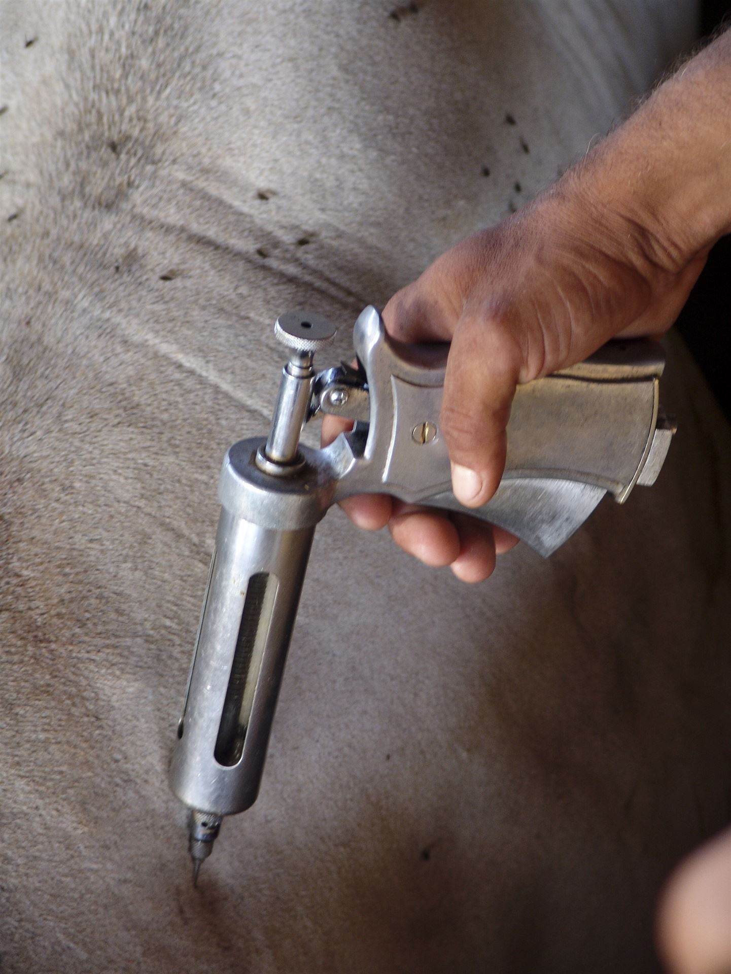 No caso da vacinação contra a raiva, a maioria dos fabricantes indicam 2 ml por animal, aplicação intramuscular em animais acima dos 4 meses de idade. A administração intramuscular deve ocorrer no interior do músculo, na tábua do pescoço com a pistola de vacinação perpendicular ao corpo do animal.